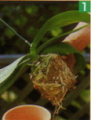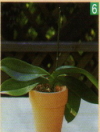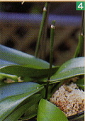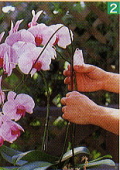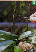 | 基部の花がしおれてきたら、切り戻して二番花を咲かせるとよい | まず、花茎と支柱を結んでいるテープを外し、そっと支柱を抜き取る | 株元から2~3節を残し、その節の1cmほど上の位置で花茎を切り戻す | 切り戻した状態 | 3か月ほどで、また花芽が上がり、4~6か月で二番花が咲きだす |