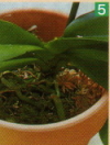 | 花が終わり、寄せ植えの株を抜いたところ。元は3.8~4号鉢に植えてあったものなので、4.5号の素焼きを用意 | 元の水ゴケが傷んでいなければ、取り除く必要はない。周囲に、適度に湿らせておいた新しい水ゴケを巻きつける | 両手の親指と人差し指を使い、株を鉢に納める | 詰め方が柔らかいと、水ゴケが過湿になり、根傷みの原因となるので、少しきつく感じるくらいの硬さに植え込む | 上部にこの程度のウォータースペースができるようにする。また、鉢底まではきつく押し込まない方がよい | 植え替え作業を終えたところ。この後は日当たりのよい場所に置いて、水は10~15日ほどは与えない |
